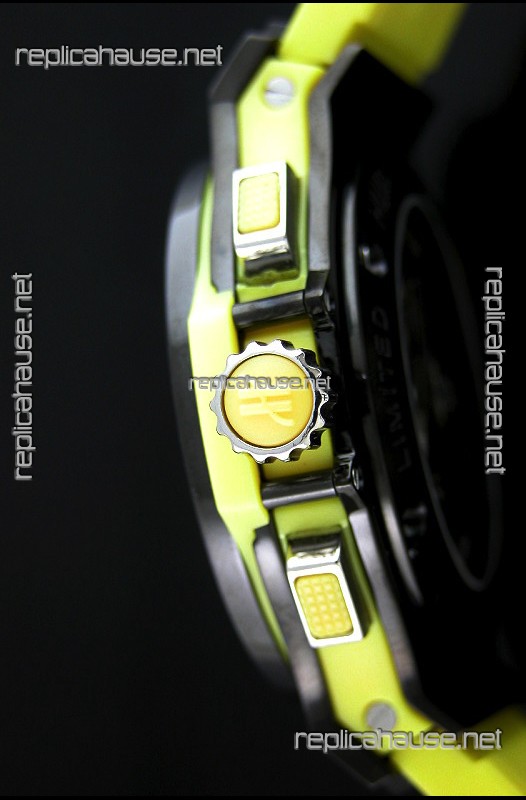 Strap: Hyrbid Yellow Leather and Rubber Strap with PVD Coated Clasp