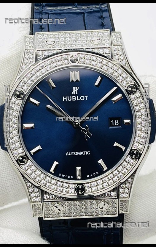 Hublot Classic Fusion Stainless Steel Diamonds Blue Dial Swiss Replica Watch 1:1 Mirror Quality