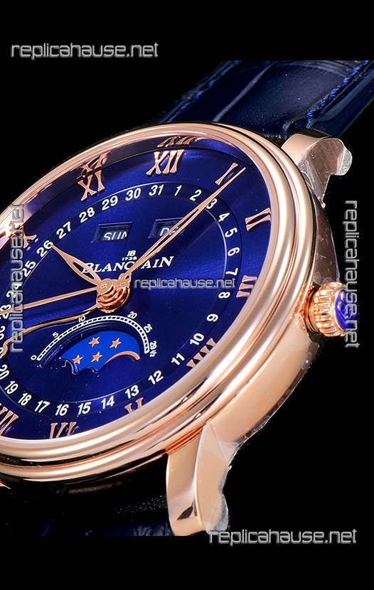 Blancpain "Villeret Quantième Complet" 904L Steel Rose Gold Watch in Blue Dial