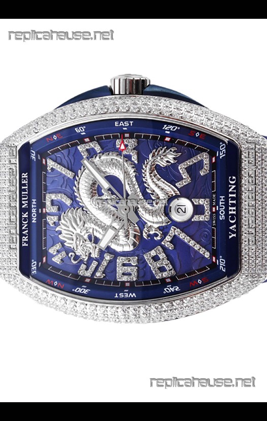 Franck Muller Vanguard Yachting Dragon V45 Blue Dial in Diamonds Bezel Swiss Replica
